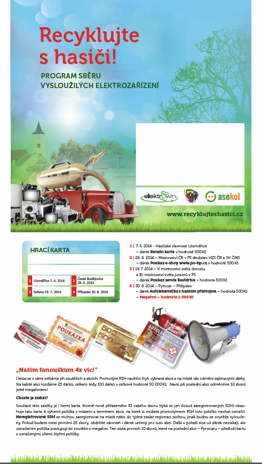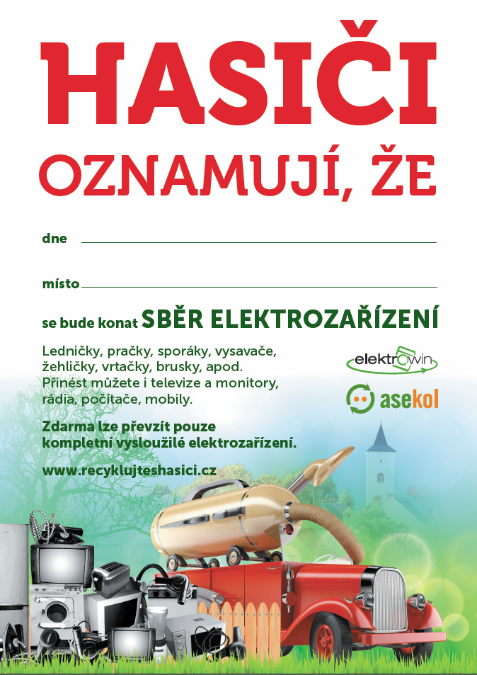 RECYKLUJTE S HASIČI 05.01.2015 19:56 nepotřebné elektrospotřebiče vybíráme každou první neděli u hasičské zbrojnice, nebo po dohodě na telefoních číslech: 737 619 245 nebo 721 275 924